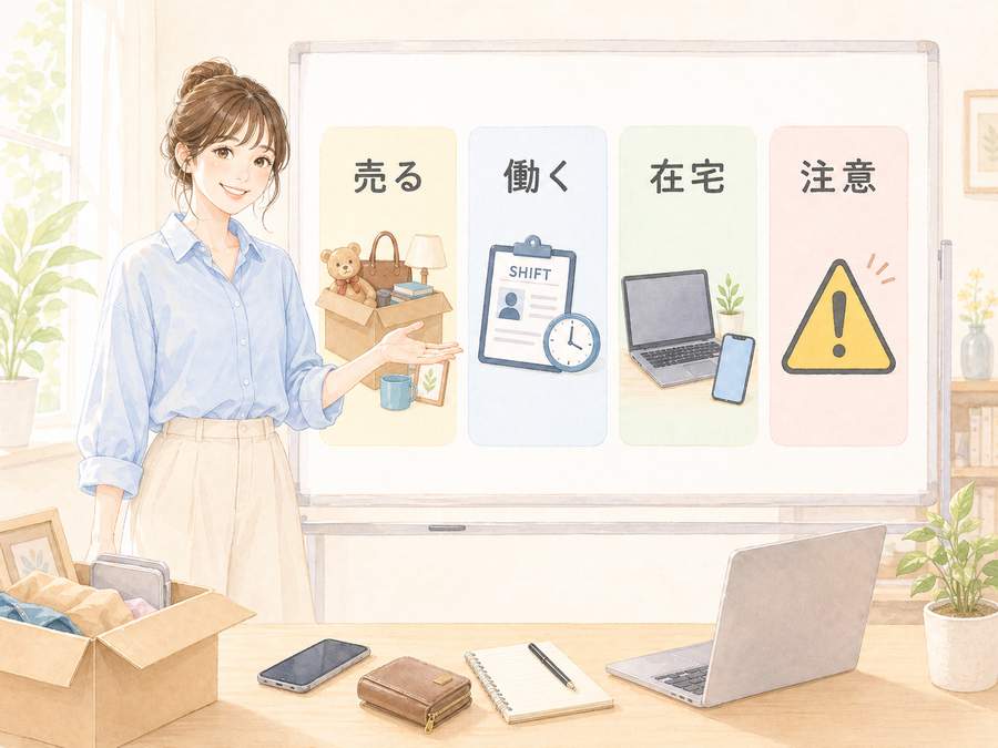 外に出にくい人は、フリマアプリ、セルフバック、モニター案件、クラウドソーシングを組み合わせる形になります。ライター、ブログ更新代行、動画編集代行などは今日すぐの即金向きではありませんが、続けることで在宅の収入源になりやすい方法です。